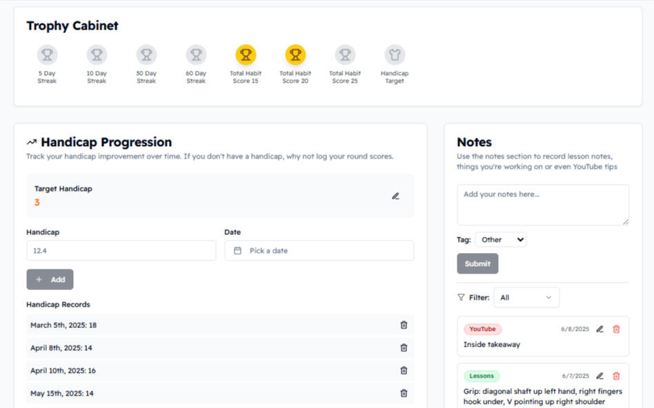 Engaging place for players to check on lessons, receive coach tips plus build and manage good habits.