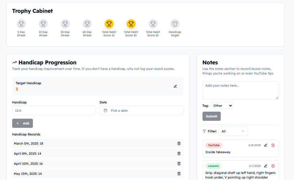 A free benefit for the players to help build a lasting relationship with the coach and solves the problem of how and where to store lesson notes for recall!- Dashboard